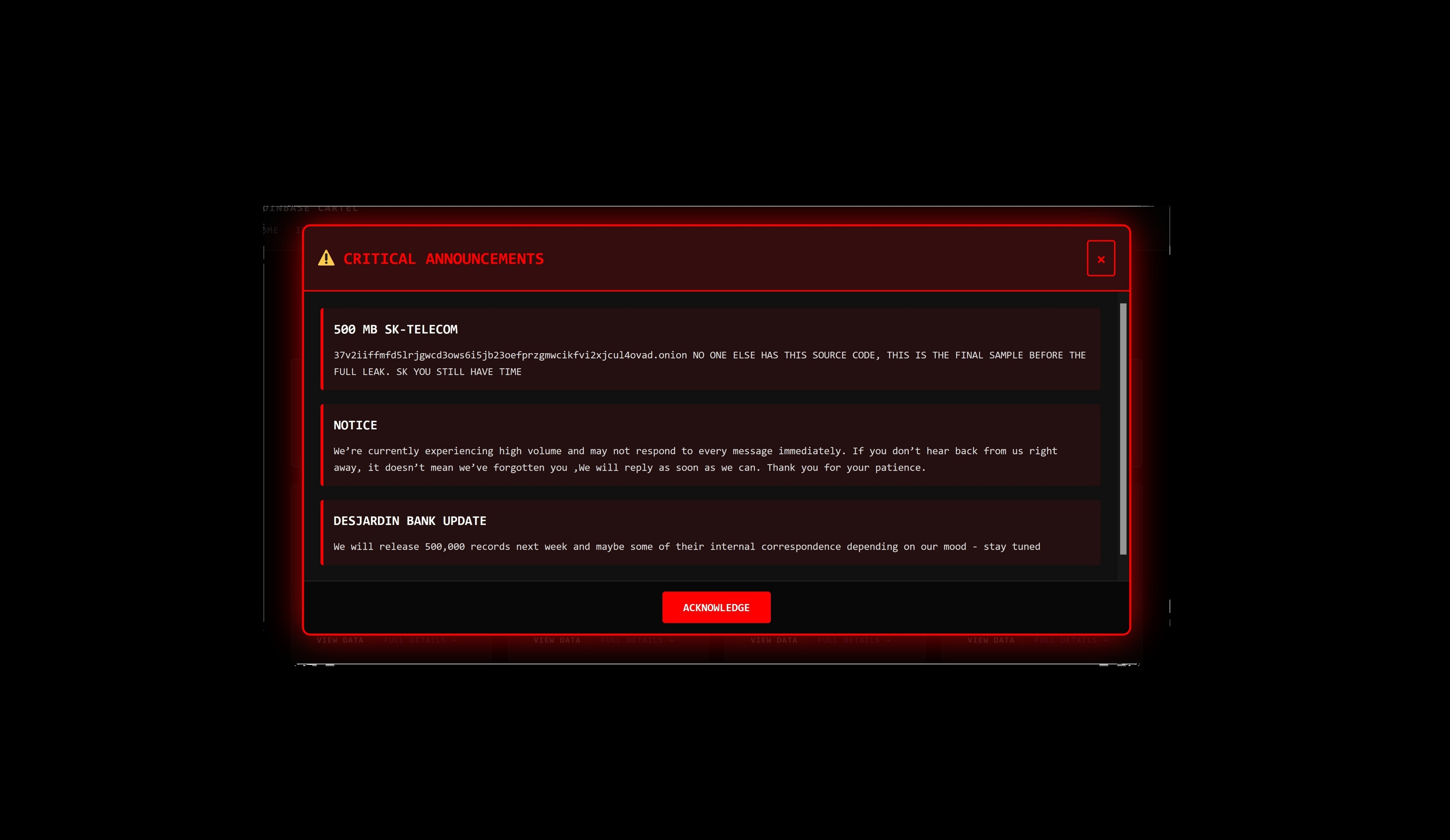 The ransomware group CoinbaseCartel is currently making ransom demands against Desjardins. Their ransomware site displays a popup that reads, "CRITICAL ANNOUNCEMENTS...DESJARDINS BANK UPDATE: We will release 500,000 records next week and maybe some of their internal correspondence depending on our mood. Stay tuned." The initial release of 50,000 records was described by the group as a "sample from their database since they think we don't have anything just wait till you see whats next".
