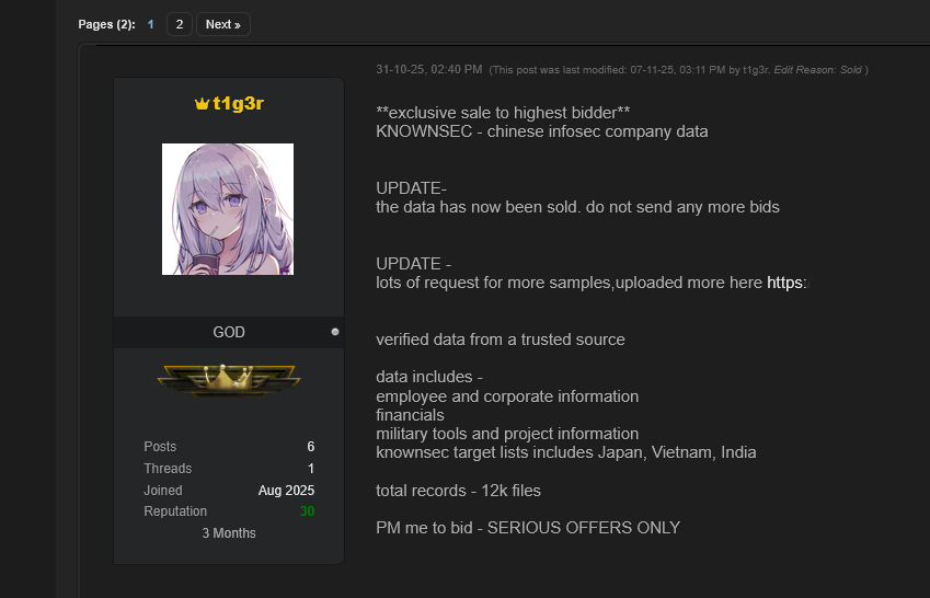 CyberAGroup can verify that the user t1g3r on a Dark web forum was offering to sell 12,000 files of “KNOWNSEC – Chinese infosec company data” on 2025 10 31 and posted 67 screenshots of the data to promote the sale. On 2025 11 07, t1g3r edited his post noting the data had been sold.